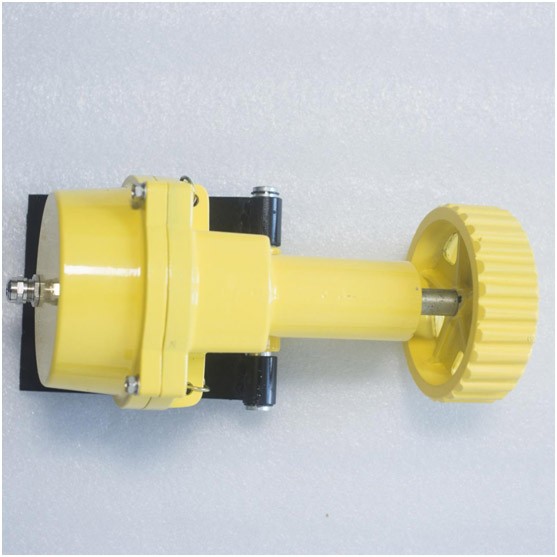 打滑检测器工作时,通过胶带带动触轮,使触轮反应出胶带的实际带速,触轮带动检测器内传动轴,使产品内部继电器工作,继电器工作主要是由轮片切割光电信号,由内设固定数值与实际值产生对比数值从而产生通断信号,完成检测带速工作,如果胶带速度与主滚筒速度不同步并下降到正常带速的20-30%时,接点通断信号发生变化,重新输出一组信号给控制室,警示工作人员胶带已处于严重打滑状态。