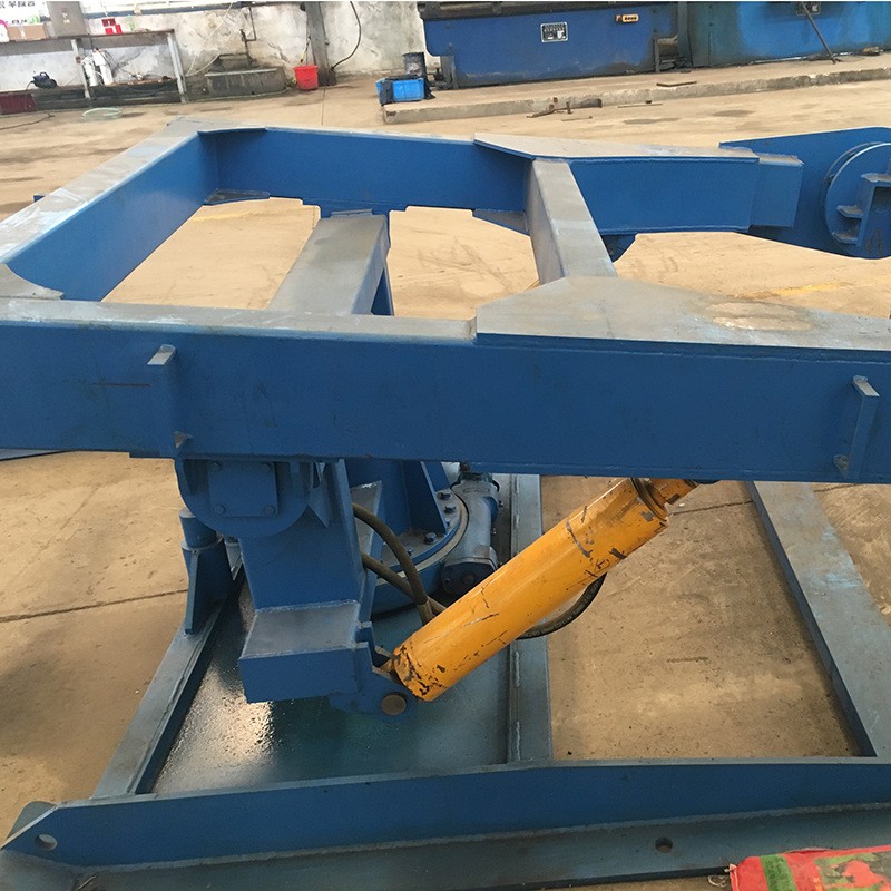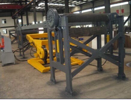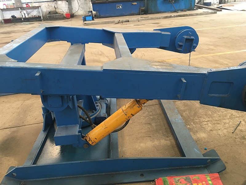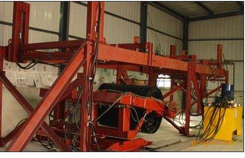 该装置布置在伸缩带式输送机贮带仓的后方,整套设备的动力均由液压泵站提供。当贮带仓贮满输送带时,先通过固定夹带装置把皮带夹住,防止皮带跑掉,当卷带完成皮带接头连好后才能松开。抽带机构由液压马达带动上滚筒转动,下滚筒由两个液压油缸支起,将皮带压在上下滚筒之间,随着液压马达不断的转动,皮带就松弛下来,此时将皮带接头拆开,就可以进行卷带,卷带结束后,支承下滚筒的液压油缸松开,下滚筒复位。卷带机构由液压马达带动,卷带力大,速度可控,可卷带长120米左右,摇臂可上下左右摆动以保证卷带整齐,并可实现180°内旋转把卷好的皮带移出皮带机架。